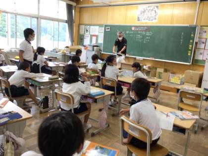 4年生が理科の「閉じこめられた空気や水」の授業で実験をしました。空気鉄炮にペンギンの形をしたスポンジを入れて、ピストンを力いっぱい押しました。すると、中のペンギンの形がゆがんでつぶれたり小さくなったりしました。「圧がかかっているんじゃかいかな」という意見が子どもたちから出ました。