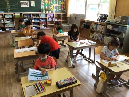 「いろいろなかたち」で、まる、さんかく、しかくの形をなぞりました。なぞった形を使って、絵を描きました。みんな想像力豊かです。