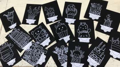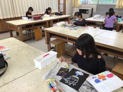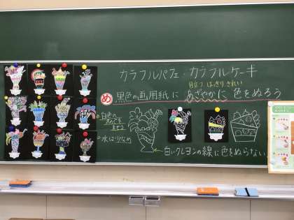 3年生は図画工作の授業で、カラフルなパフェやケーキの絵を描きました。カフェにあるようなブラックボードを模した黒色の画用紙に色をつけてカラフルに仕上げるために、絵の具に少し白色を混ぜるといいことや水を少なめにするといいことがわかりました。できあがった作品は、どれもとてもおいしそうに仕上がりました。
