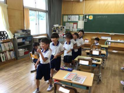 算数の単元「ふえたりへったり」でバスごっこをしました。実際にバスに乗ったり降りたりして、人が増えたり減ったりするのを体験しました。