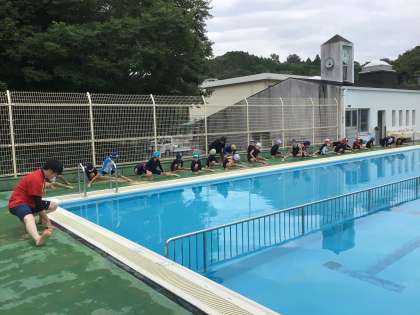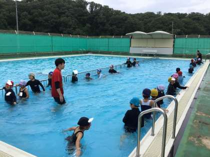 朝は気温が低かったのですが、次第に上がり、プールに入ることができました。1年生にとっては、小学校生活初めての水泳学習でした。教室からプールに移動して、更衣室で着替えます。挨拶、体操を済ませ、シャワーを浴びます。プールサイドを走らないなどのルールを確認して、いざ、プールの中へ入ります。早く着替えや準備ができたので、プールの中でぐるぐる回りをしたり、じゃんけん列車をしたりすることができました。次の水泳の授業も楽しみですね。