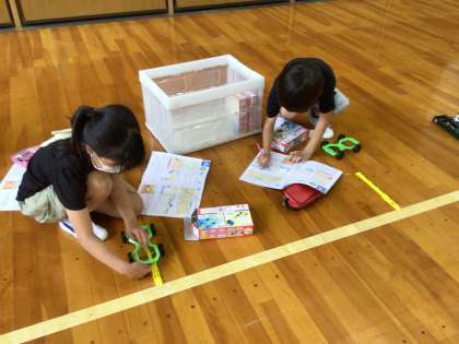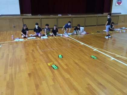 ゴムで動く車を作って体育館で実験を行いました。ゴムの伸ばし方を変えた時に車の進む距離が何メートル変わるか調べました。子どもたちは実験を楽しみながら行い、記録した距離から気づいたことを理科ノートにまとめました。