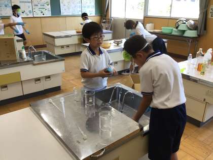 4年生の総合は、現在、いくつかのリサイクル活動を行っています。今回は、家庭から持ち寄った廃油を使った石けん作りをしました。最初の苛性ソーダを水に溶かすところは危険を伴うので教員が行い、その水溶液に廃油を入れて1時間近く混ぜる作業を児童が行いました。一人では手が疲れてしまうため、交代でかき混ぜるとともに、使った容器が油まみれになっているので丁寧に洗う作業も行い、大変でした。夏休み前には、立派な石けんができ、いろいろな人に渡すことができればと考えています。