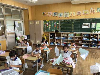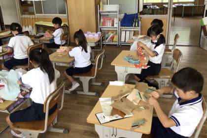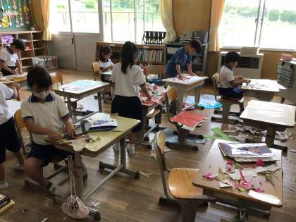 1年生 図画工作 公開日 2023/06/20 更新日 2023/06/20 各学年から 「やぶいたかたちからうまれたよ」で、包装紙などをそっと破ったり、ちぎったりしました。破った紙が何の形に見えるかを考えて、作品にしました。
