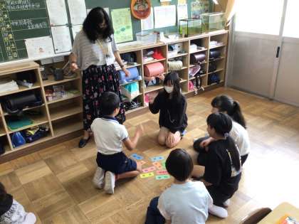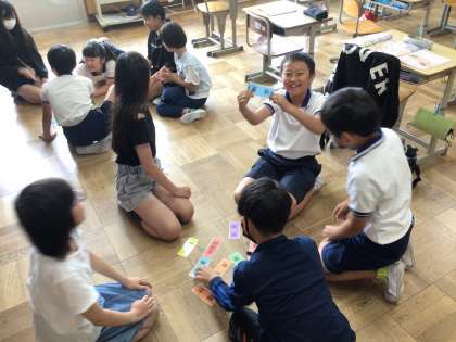 外国語の単元「Unit3 What do yo want to study?」では、「学びたい教科やなりたい職業を伝えよう」ということを最終目標にして、活動に取り組んでいます。日本語で教科が書かれた札を各グループで囲み、ALTが英語で言った教科の札を取るといったカルタ方式の活動を行い、楽しみながら英単語を覚えています。
