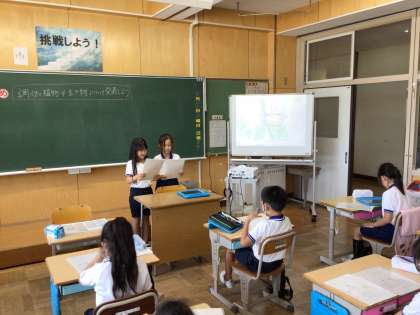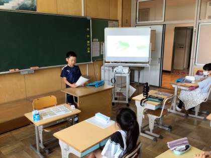 大畑小学校の敷地内で見つけた生き物や植物について調べたことを発表しました。藤の花、ドクダミの花、ニホンアマガエルやツマグロヒョウモンなど、多くの種類の発表を聞くことができました。発表後は、質問や感想を伝え合う時間をもちました。今後は学習発表会に向けて調べ学習を進め、まとめ方や発表方法を工夫していきます。