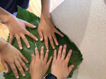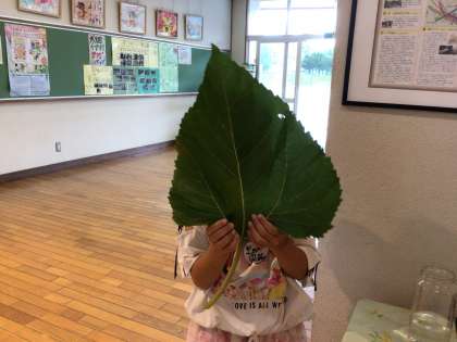 手のひらよりも、顔よりも、大きな葉っぱが、児童玄関に飾られています。
