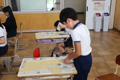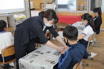 豊田市中央図書館から、講師をお招きし、「新聞紙となかよくなろう!」というテーマで学習しました。活動では、新聞の一面を一つのパズルにした「新聞パズル」を通して、新聞の構成は、記事の内容を一目で伝えるための「見出し」や記事の本文を短くまとめた「リード文」などから成り立っていることを学びました。また、「新聞クイズ」で新聞社に1日に届く情報数は、7000本ということを聞き、驚いている子どもの姿が見られました。今後は、新聞の構成を理解した上で、書き手の意図を読み取ることを行っていきます。
