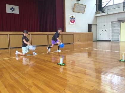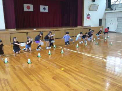 風の強さを変えると、ものの動き方はどのように変わるか予想を立て、風で動く車をうちわであおいで走らせました。子どもたちは楽しみながら実験をし、的に強く風を当てるとよく進むことに気づきました。次回は、送風機を使って風の強弱によって、進む距離は何メートル変化するか実験をします。