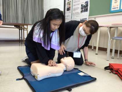 消防署の方に来ていただき、胸骨圧迫やAEDの使い方を学びました。