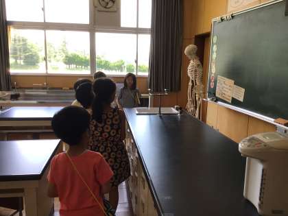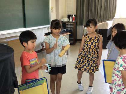 2年生が大畑小学校のいろいろな教室についての説明やクイズを考えて、1年生を案内してくれました。普段入ることがない理科室や家庭科室も訪れ、見学しました。校長室の前にばたっぴぃがいくつあるのかを一緒に数えたり、音楽室で楽器を鳴らしたり、とても楽しく発見がたくさんの学校探検になりました。
