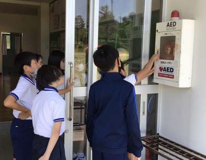 応急手当講習の後、学校にある本物のAEDを確認しました。