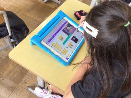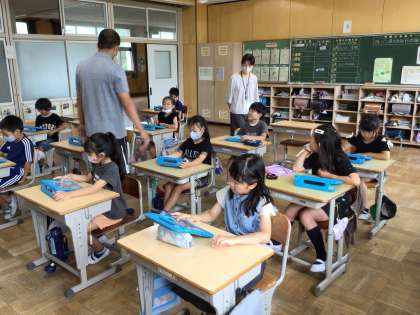 3年生は、スクラッチというプログラミングの学習をしました。猫などの生き物やバナナなどのキャラクターを選んで、いろいろな方向に動かしたり回転させたりするプログラムを組みました。今日は、教育委員会からICT支援員の方も来校し、子ども達の活動を支えていただきました。