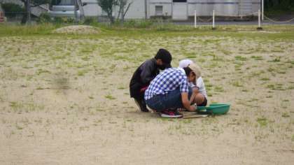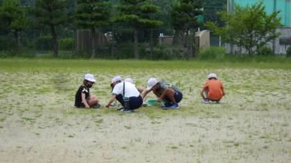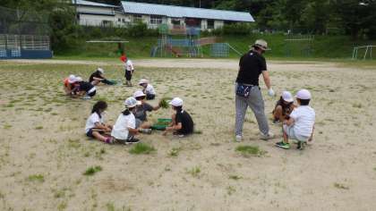 今日の縦割り班掃除のときに、外掃除の分担になっている班のみんなで草取りを行いました。毎週水曜日は、外掃除になっていますが、熱中症にならないように、WBGTが高くない日に行うようにしています。今日は気温があまり高くなかったので、草取りができました。みんな集中して草を取ったり、取った草を率先して片付けたりしていました。