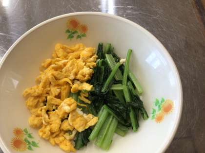 家庭科で、スクランブルエッグと小松菜の野菜炒めを作りました。仲間と協力して活動することができました。自分で作った料理は、味も格別でした。
