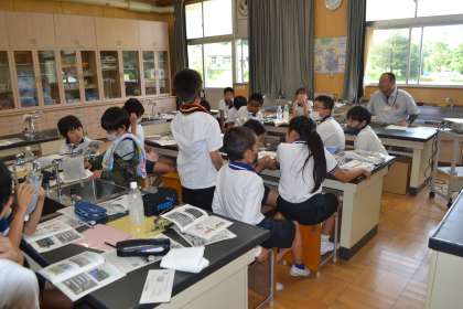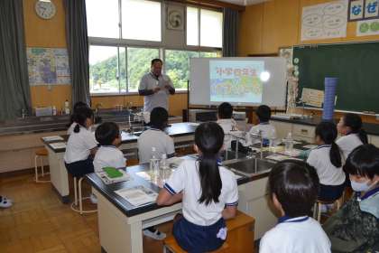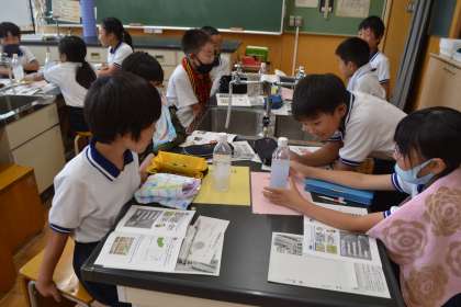 4年生は、豊田市上下水道局から講師をお招きし、下水道出前授業を受けました。最初に、家庭で使った水が下水道管を通って下水処理場に送られ、そこで微生物によってきれいな水に変えられてから海に戻すという説明を受けました。次に、ティッシュペーパーとトイレットペーパーのどちらをトイレに流してもよいかを、実験で確かめました。ペットボトルに入れたトイレットペーパーは、振るとすぐに溶けましたが、ティッシュペーパーはなかなか溶けませんでした。最後の質疑応答では、子どもたちからたくさんの質問が出されました 。油を流すと水道管が詰まるということを聞き、水についてもごみと同じで分別が必要なことを学びました。