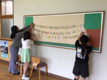 特別活動室の掲示板(職員室と保健室の間)がリニューアルされました。古い掲示物をはがしていると、「手伝うよ」とみるみるうちに人が増えました。掲示のアイデアを考えたALTも「Lots of helpers! Very nice!」と喜んでいました。来校された際は、ぜひリニューアルされた掲示板をご覧ください。