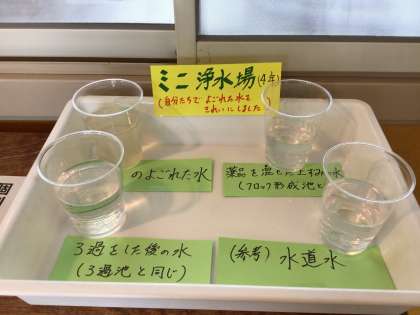 4年生社会科「水はどこから」 公開日 2023/07/12 更新日 2023/07/12 各学年から 4年生は社会科で、豊田市の上下水道について学習しています。その中で、浄水場で矢作川から取り入れた水をきれいにしていることが分かったので、自分たちでも水をきれいにしてみました。汚い水に、ミョウバンと重曹の水溶液を入れ、汚れを沈殿させた後、上澄み液をろ過しました。見た目は水道水と変わらないきれいな水になり、子どもたちは驚いていました。