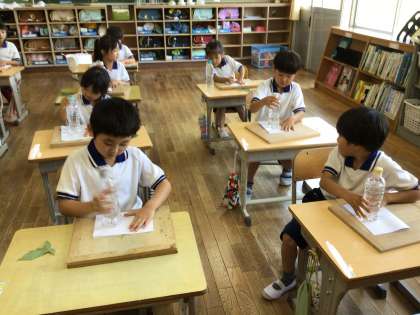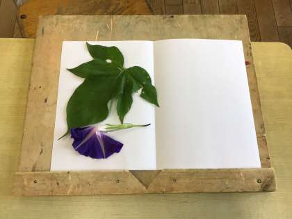 色水作りに続いて、たたきぞめ、押し花づくりを行いました。たたくときの力加減が難しく、紙が破れてしまった子もいましたが、あさがおや葉の色がきれいに紙に出ました。押し花も本の間に挟んで、出来上がるのを待ちます。完成が楽しみです。