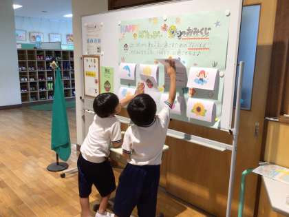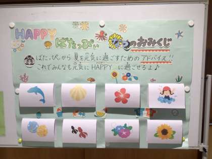 「Happyばたっぴぃ夏のおみくじ」 公開日 2023/07/13 更新日 2023/07/13 校長室から 保健室の掲示物が新しくなりました。「Happyばたっぴぃ夏のおみくじ」です。 学校マスコットキャラクター「ばたっぴぃ」が、夏を健康に過ごすためのアドバイスをくれるというものです。 くじ引きのように楽しみながら、健康に過ごす方法を学ぶことができます。 さっそく、遊びにきてくれた子がいました。 保護者や地域のみなさまも、ご来校の際には、ぜひご覧ください。