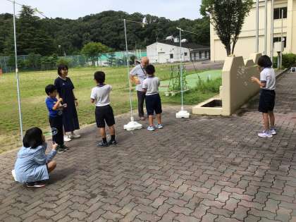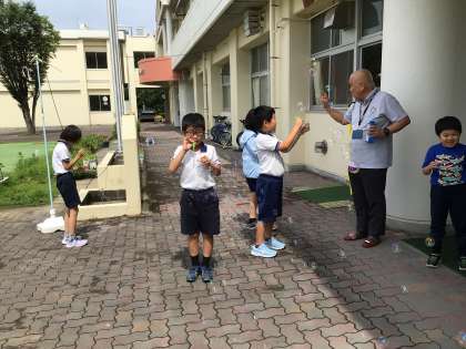 あおば学級 自立活動楽しい 公開日 2023/07/14 更新日 2023/07/14 各学年から 今日は、バルクとよたから講師の先生に来ていただき、一緒に自立活動の学習をしました。舌を動かす練習をしたあと、シャボン玉作りをしました。シャボン玉を作ることで、息の吐き方の調節を図るということをしました。みんなとても上手にできていて、講師の先生も感心してくださいました。とても楽しく学習ができました。