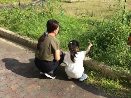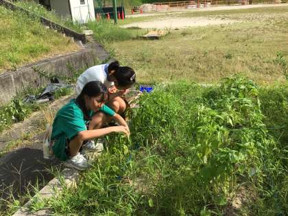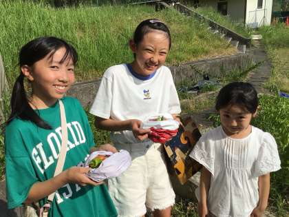 大畑っ子が畑の様子を見に来て、野菜の収穫をしました。こんな暑さの中でも、ミニトマトちゃんやオクラちゃん、バジルちゃん、ピーマンちゃんは元気に育っています。