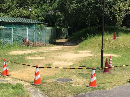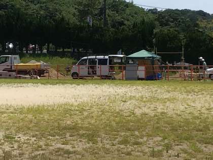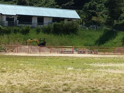遊具設置の工事が進んでいます。遊具の基礎となるコンクリートのブロックが置かれたり、きれいに整地するための砂が運び込まれたりしています。いよいよ遊具を実際に設置する作業になってきます。校舎裏のブランコやタイヤ、土管のあったところはきれいに整地されています。業者の方は、全国トップクラスの暑さの中、子どもたちのためにがんばってくださっています。