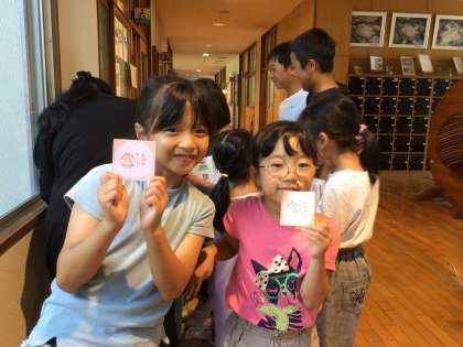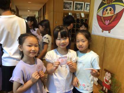 大畑っ子を応援している人が作成した「大畑小学校 ばたっぴぃ」のスタンプをふせんに押してもらい、喜ぶ大畑っ子たちです。大畑小学校のマスコットキャラクター「ばたっぴぃ」が地域へ、その先へじわじわと広がっています。嬉しいことです。