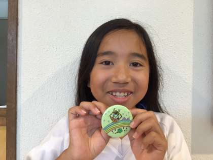 学校マスコットキャラクター「ばたっぴぃ」の缶バッジを作りました。