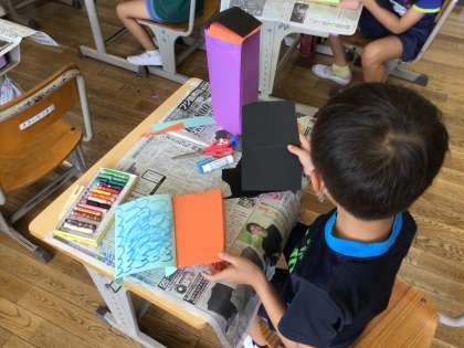 色画用紙を折って立たせて作品づくりをしました。子どもたちの中から「みんなのまちをつくろう」という声が上がり、それぞれが街にありそうなものを考えて作りました。折ったはいいけれど、立たせるにはどうしたらいいか、絵はどんなふうに描こう、別の紙を貼ったらどうなるかなど考え、工夫していました。