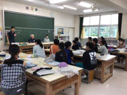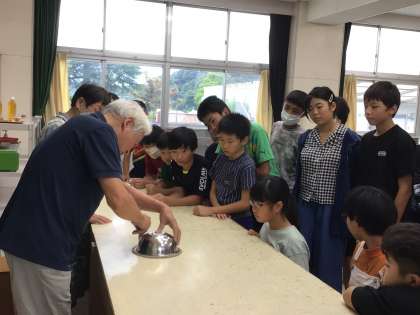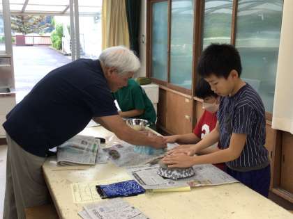 地域の陶芸家、蛯原五邦さんご夫妻を講師にお招きして、陶芸教室をしていただきました。まず初めに、用意していただいた土をくり抜き、ボウルの底を使って、形を整えました。その後、事前にトレーシングペーパーに描いておいた「ばたっぴぃ」の絵を皿に描き写しました。力加減が難しく、苦戦していた子もいましたが、とても素敵に仕上がりました。お皿の縁を指でなぞって、整え、第1回目の陶芸教室終了です。次の絵付け体験もとても楽しみです。