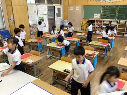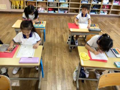 久しぶりにALTの先生と一緒に外国語の活動をしました。今日は、好きな色の名前を英語で言ったり、英語で色の名前を聞き取ってその色を見つけてタッチするゲームをしたりしました。最後は、英語で聞き取った色や形の名前にあわせて塗り絵をして、楽しく活動しました。
