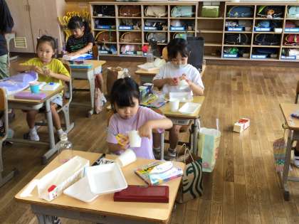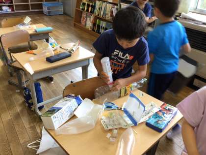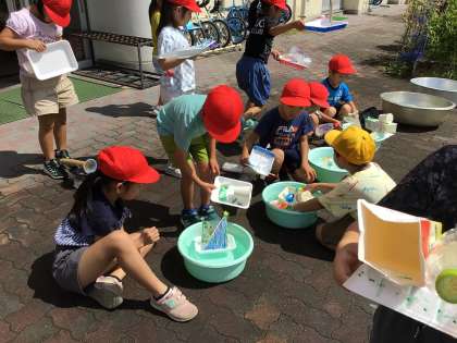 1年生 生活科「たのしいあそびがいっぱい」 公開日 2023/09/19 更新日 2023/09/19 学校行事 家で用意してもらった材料を使って、船を作ったり、水てっぽうを作ったりして遊びました。真っ直ぐ進むように、風向きを考えたり、水にちゃんと浮かぶか重さを考えたり試行錯誤していました。実際に水に浮かべてから「上が重すぎるから、この部分を減らします」と言って、船を変化させている子もいました。