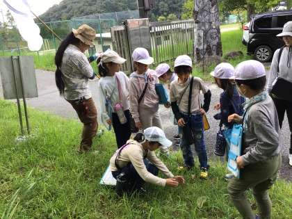後半は、実際に屋外に行き、校舎の横の草地や大畑の森で生き物を探しました。始めは小さなバッタを触ることにも躊躇していた子ども達でしたが、慣れてくると我れ先にと積極的にバッタやチョウを追いかけては捕まえていました。