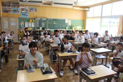 5年生から修学旅行旅行のお守りとして、学校マスコットキャラクター「ばたっぴぃ」と修学旅行で巡る観光地入りの缶バッチと、メッセージの書かれたしおりをもらいました。うれしくて、友達と笑顔で見せ合うぐらい喜んでいましたね。代表の5年生が「6年生の旅行中は、僕たち5年生に大畑を任せてください!」とメッセージをくれました。その言葉が、とっても力強くてたくましく感じました。5年生のおかげで、きっと明日から素敵な修学旅行になると思えました。5年生の皆さん、ありがとう。