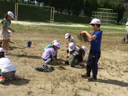 大畑小学校の運動場をきれいにするために、草取りボランティアの皆さんが来てくださいました。今日は、1、2、5年生とあおば学級のみんなでボランティアさんと一緒に草取りをしました。ボランティアの皆さん、朝早くからお忙しい中来てくださり、ありがとうございました。