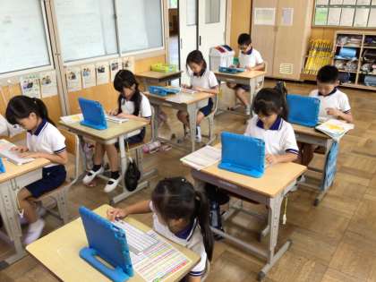 学習用タブレットにキーボードをつなげ、夏休み前に学習したローマ字での入力にチャレンジしています。簡単な文を入力することができるようになりました。今後も続けていき、ローマ字を覚えられるようタイピング練習していきます。