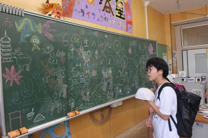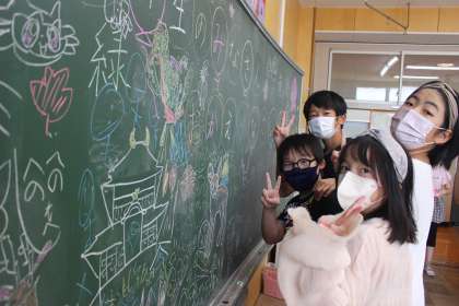 修学旅行を終えた6年生が登校すると、教室の窓に「おかえりなさい」メッセージが掲示されていていました。疲れ気味の登校でしたが、発見した6年生が、にっこり笑顔になりました。教室に入ると黒板やホワイトボードには、たくさんのメッセージと、イラストが描かれていました。目を輝かせながら見つめている6年生たち。「1年生から5年生の優しい気持ちがうれしい」と、喜んでいました。