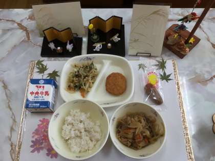 今日の給食は「月見献立」でした。豚丼、牛乳、里芋コロッケ、おかかあえ、月見だんごをいただきました。