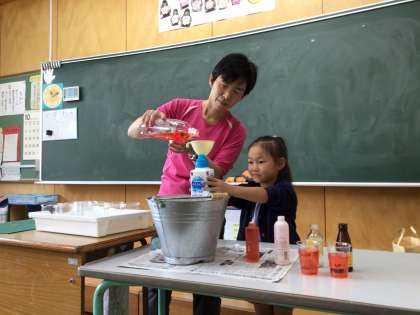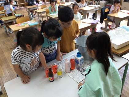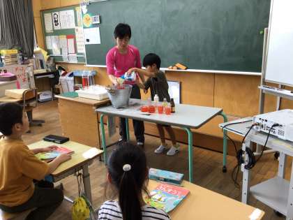 どちらの瓶の方がたくさん水が入るか、予想をしてから、色のついた水を入れかえたり、同じ大きさのコップ、ビーカーに移したりしてかさ比べをしました。形が違う入れ物のかさを比べるには、同じ形の入れ物で調べるとよく分かりました。