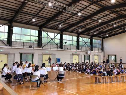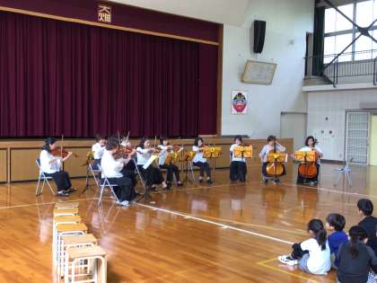 管弦楽鑑賞会 公開日 2023/10/11 更新日 2023/10/11 各学年から 「永田真理子とアンサンブルひまわり」の皆さんをお招きして、管弦楽の鑑賞会を行いました。バイオリン、ビオラ、チェロという普段近くで聴く機会があまりない楽器の音色を生で聴くことができました。音楽に合わせて、首を振ったり、身体でリズムを取ったりする児童もいました。