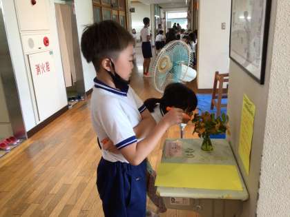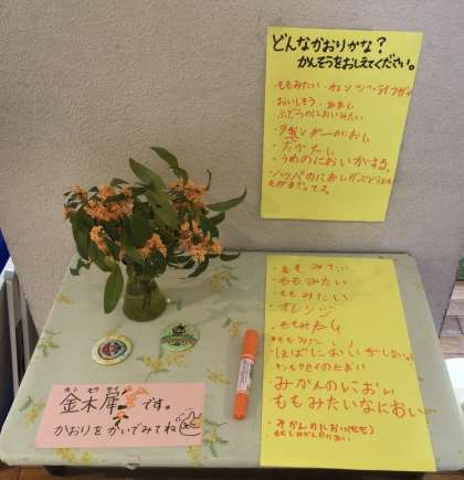 児童玄関にキンモクセイを飾りました。廊下や玄関に、よい香りが漂っています。