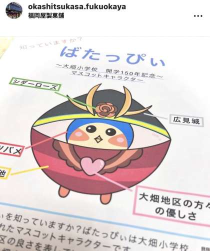 大畑小学校マスコットキャラクター「ばたっぴぃ」の練り切りが福岡屋さんのインスタグラムで紹介されました。手間ひまかかった手作りの「ばたっぴぃ」の練り切りが勢揃いした写真は、圧巻でした。さらに、嬉しいことには、和菓子の写真だけでなく、6年生が作った「ばたっぴぃ」を紹介したチラシも一緒に掲載してくださっていました。地域の方々が大畑小学校を応援して、お力を貸してくださっていることに感謝しています。福岡屋さんを訪れた大畑っ子や卒業生も「ばたっぴぃが福岡屋さんにいたよ!」「非売品だって」などと話して盛り上がっていました。福岡屋さん、ありがとうございました。