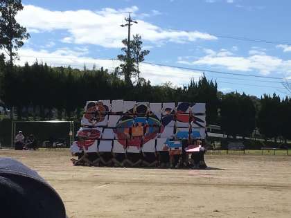 昨年度の大畑フェスティバルで学校マスコットキャラクター「ばたっぴぃ」というアイドルが誕生しました。演技中に使われる紅白のパネルには、「ばたっぴぃ」のイラストと、今年のスローガンが描かれていました。「心を燃やせ!かがやけ!ばたっぴぃと、103人の推しの子たち」というスローガンを胸に、地域の方や保護者の皆さんなど、大畑小にかかわる全ての人へ、感謝と自分たちの未来への決意を伝えました!