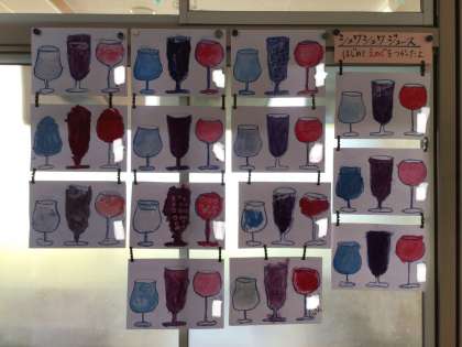 シュワシュワジュースは、いちごジュース、ソーダ、葡萄ジュースです。同じ紫色でも、人によって赤みが強かったり、青みが強かったりして、違っていてとても興味深いですね。