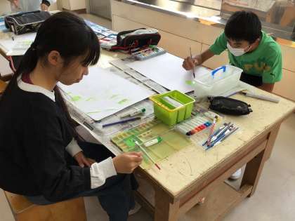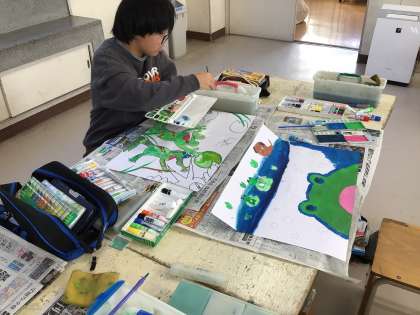 「絵の具の色を生かして色をぬろう」というめあてを立てて、読書感想画を制作しています。2匹のカエルのお話とピアノのお話から一つを選んで想像を膨らませて作品を仕上げています。下書きにこだわるところも、6年生らしさが感じられます。