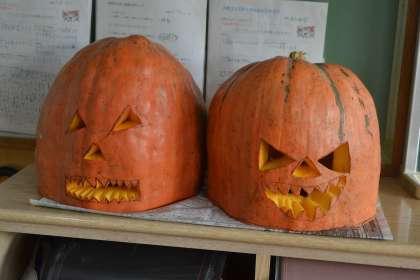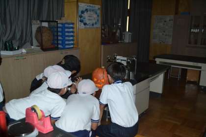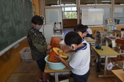 4年生の総合的な学習の時間にハロウィンで飾るジャック・オ・ランタンを作りました。大きなカボチャを切る時は、担任が行い、中身を出したり、見た目をきれいにしたりするのは子どもたちが行いました。完成したら、以前、廃油で作ったろうそくを中に入れて火を灯しました。幻想的な雰囲気になりました。