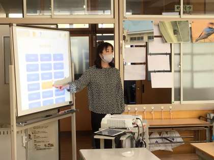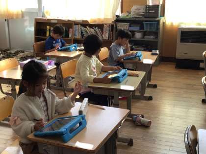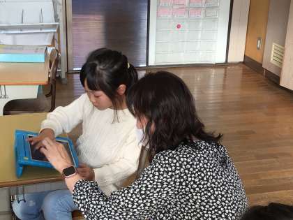 ICT支援員の先生をお招きして、学習用タブレットのアプリ「スクラッチ」を操作しました。子どもたちは、支援員の先生の話をよく聞いて、ねこがりんごを食べるように、プログラミングしました。プログラミングがうまくいくと「やったあ」と嬉しそうに動きを確認していました。