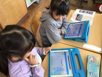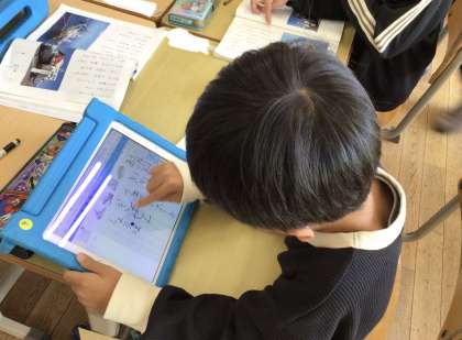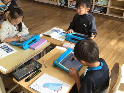 「いろいろなふね」の教材文を読んで、船の名前などをワークシートに書き込みました。学習用タブレットを使って、発表ノートに手書きしました。初めは、画面上で書き込むのに苦心していた子どもたちでしたが、みるみるうちにできるようになりました。