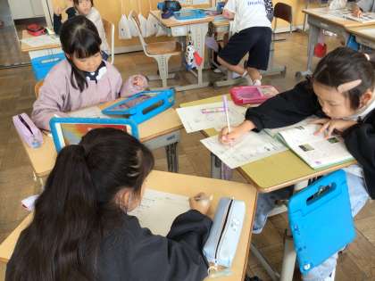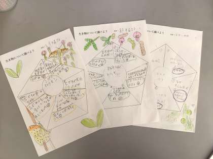 豊田市中央図書館から講師をお招きして、出前授業を行いました。生き物探しで見つけた植物や生き物について、調べたいことをまとめた五角形のペンタゴンシートをもとに、本やタブレットを使った調べ方について詳しく教えてもらいました。似たものを調べている子でグループを作り、協力して調べ学習をしました。